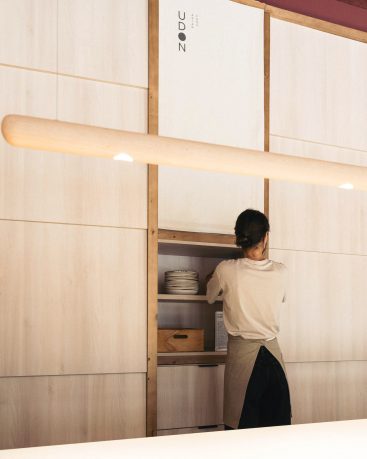 La madera natural pasa a ser el material dominante en los nuevos locales, caracterizados por los colores neutros. También se abren más las cocinas a la vista del público y se mantiene, eso sí, parte del mobiliario diseñado ad hoc para UDON, como las largas mesas blancas de córian y los característicos taburetes en forma de zeta.